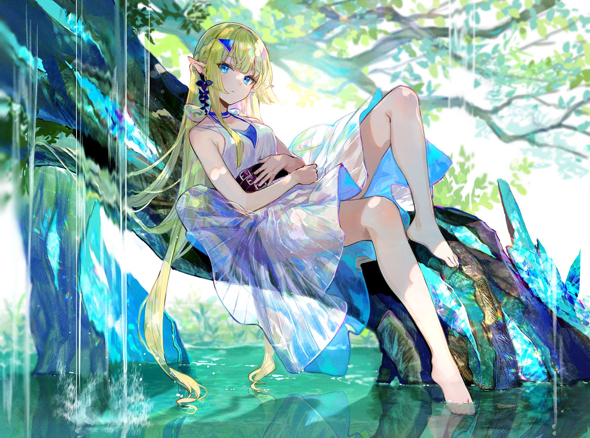 赤脚 金色长发 精灵 透视 白色连衣裙