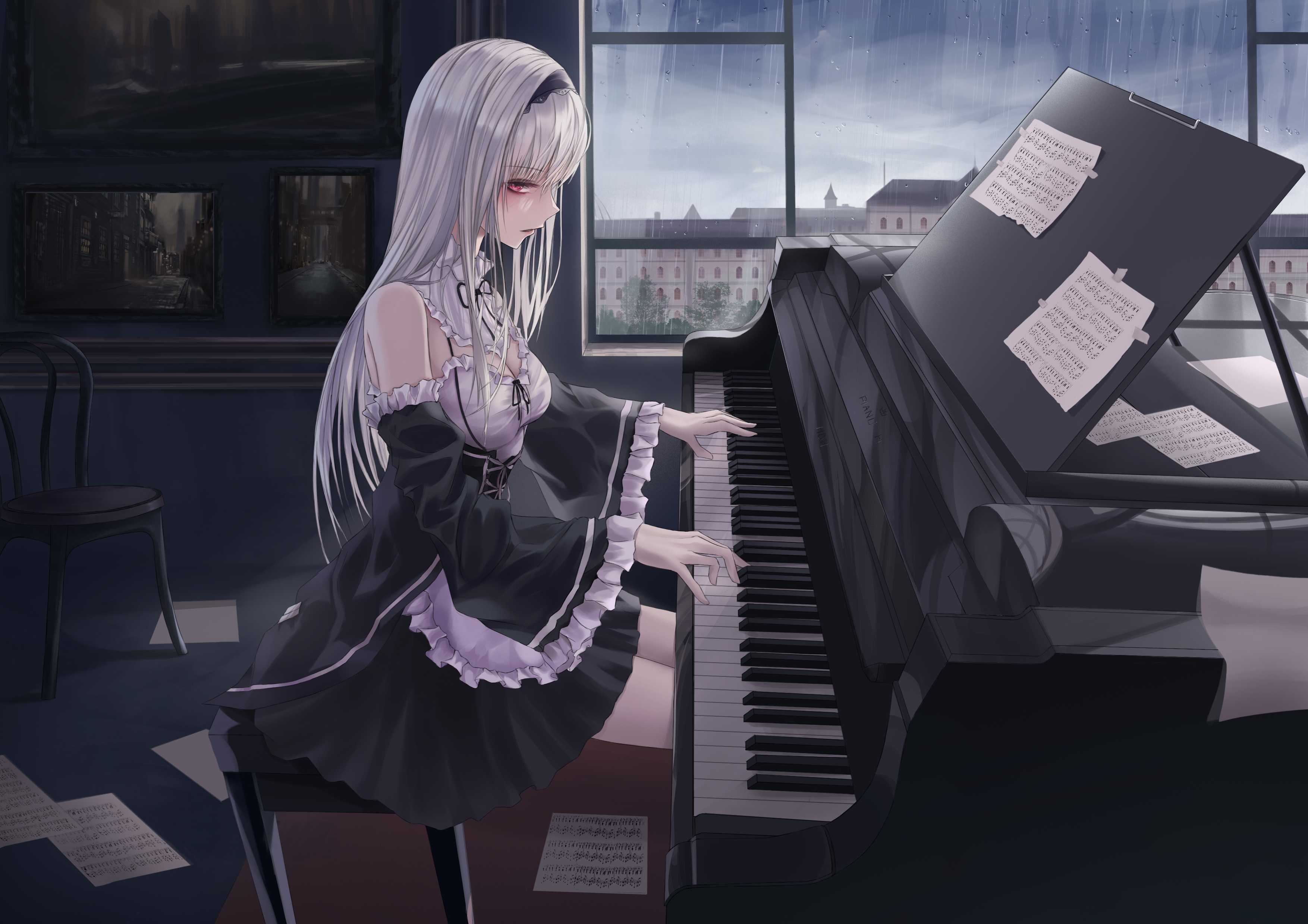 Pid:90636314女孩子 女仆 钢琴 银发 哥特萝莉
